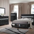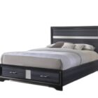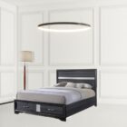 This bedroom collection offers sophisticated look, clean lines and contemporary style. Features panel headboard, and storage footboard in rich black finish with contrasting light gray trim panel, which provides elegant style that will bring you a perfect sleek design for your home.