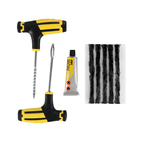 One set perfect tire repairing tool including 1 Tire Repair Glue, 5 Tire Repair Patches, 1 Drill, 1 Thread Drill. Your best tire plug kit, enables you to get to a service center safely