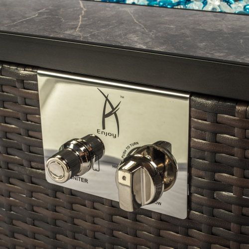 On the Stainless Steel made control panel shining in a mirror grade, matching with the Luxury Chromed Pulse Ignition & Gearless control knob that turns the warm and beautiful fire flames as you wish upon the SS burner ring and color-mixed decorative glass rocks, creating an excellent enjoyment in your Patio, Backyard, Poolside or Garden, without Smog and ashes.
