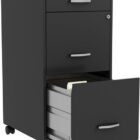 Soho file cabinet offers convenient storage of files and supplies with an accessory drawer on top and two file drawers with Smooth-Glide suspension. The accessory drawer is perfect for cell phones, tablets, cables and small supplies. The full high-side drawers accommodate letter-size, hanging file folders. The lock secures the two top drawers. Four casters allow you to move the pedestal where you need it. Three-drawer organizer also includes an 18″ Depth, recessed plastic handles and steel construction with a baked enamel finish. Usage – File Storage, Office, Cell Phone, Electronic Accessory and Multipurpose.